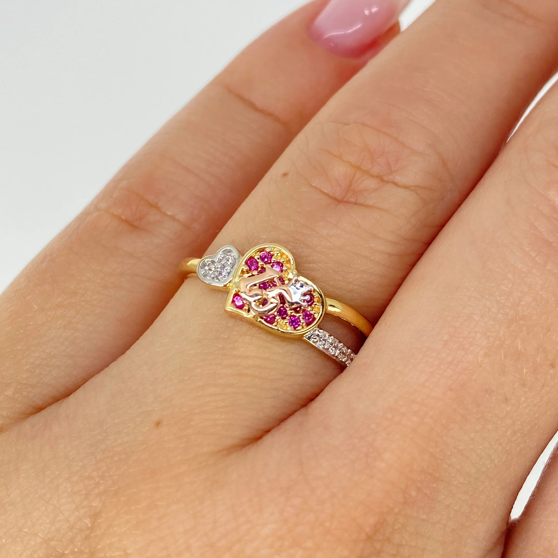 Anillo 15años Corazon Circones Blancos Fucsias Oro amarillo y Oro blanco 18k / Talla 6 1/4 / 2,15 Gr *