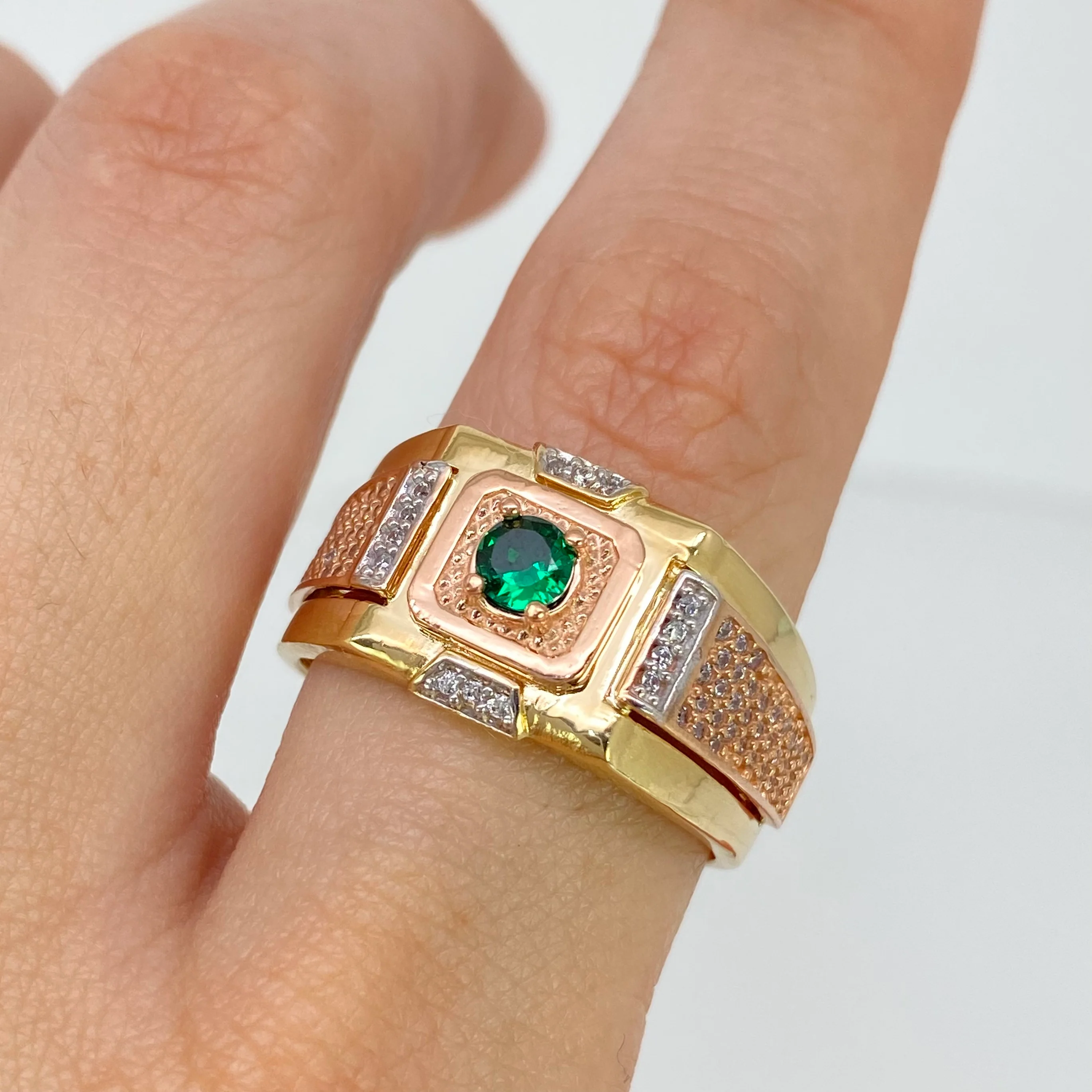 Anillo Cuadro Circon Verde Central Y Circones Blancos Tres oros 18k / Talla 10 1/4 / 8,60 Gr *
