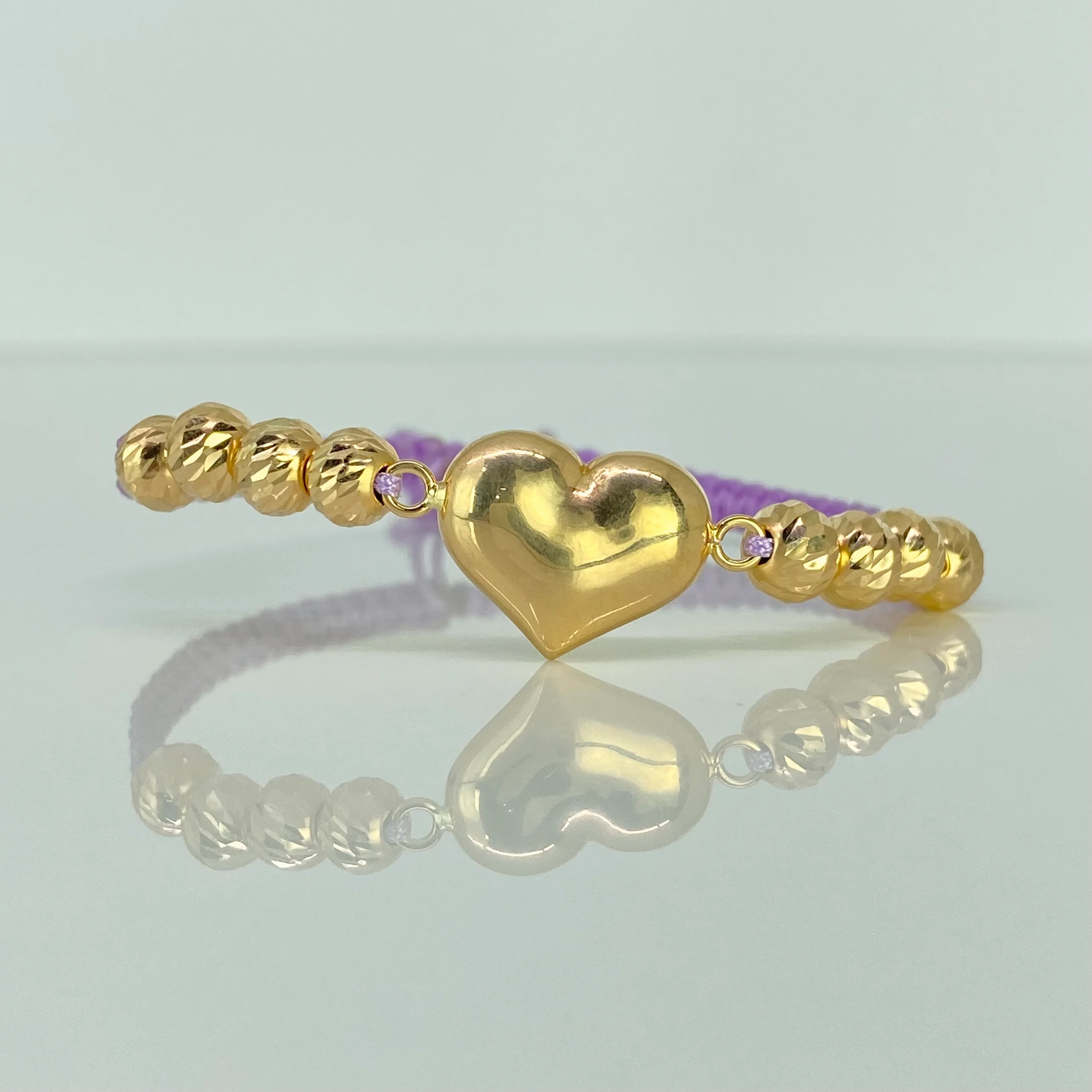 Pulsera tejida Herraje Corazon / BD 6uni 5mm / Hilo Lila Oro amarillo 18k 2,25 Gr