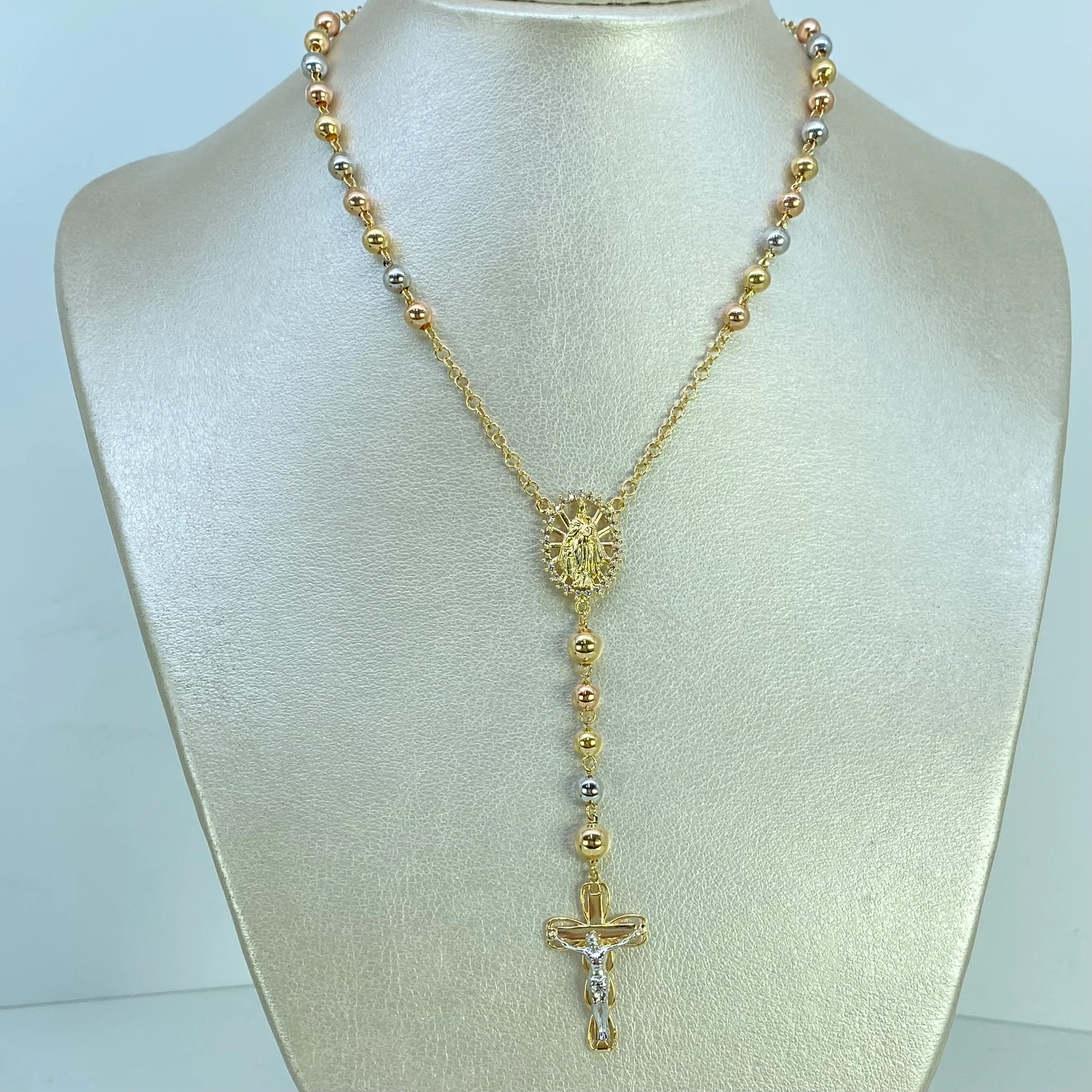 Rosario Vigen Del Carmen Bolas Lisas 6mm Circones Blancos Tres oros 18k 20,55 Gr / 5 mm / 65 Cm *